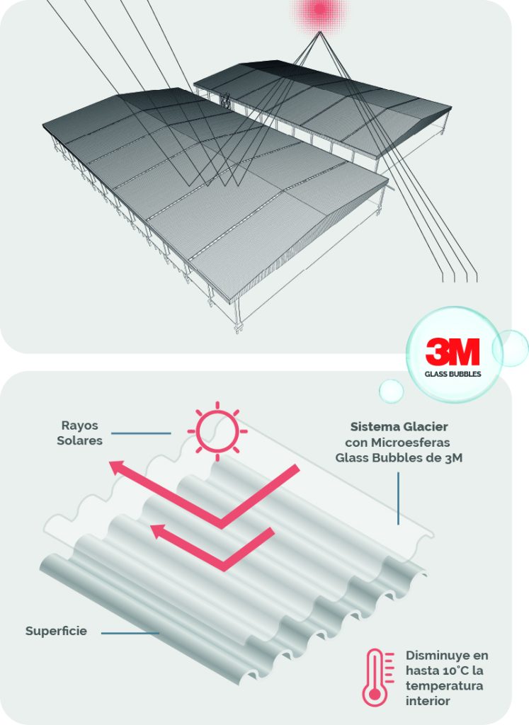 “Glacier”, with 20% recycled EPS material, is a paint designed for outdoor use. It reduces the temperature of hot spaces by up to 8 °C*, thanks to a highly reflective formulation and 3M Glass Bubbles inside.